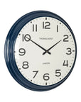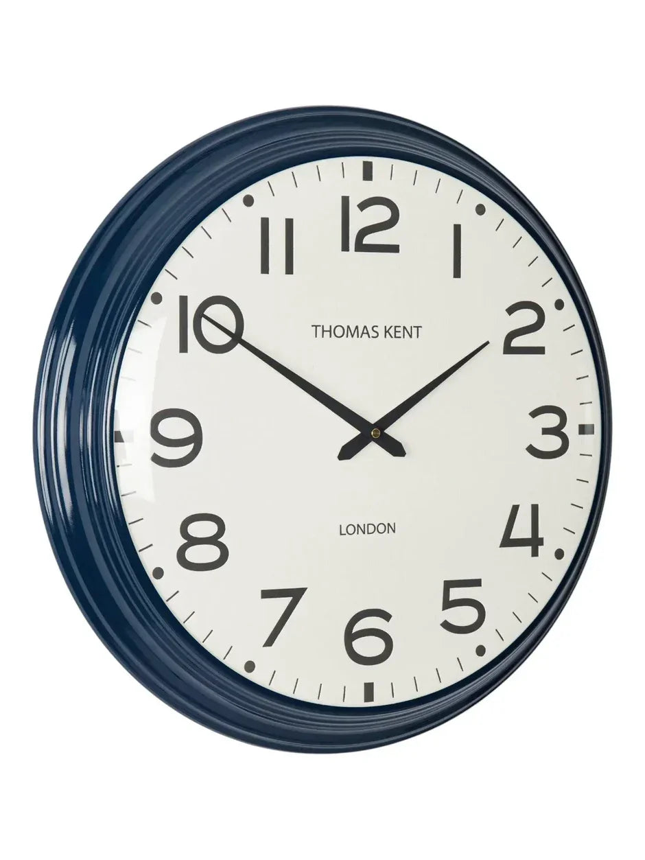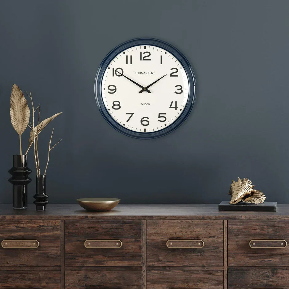 Capturing the simplicity of a station clock, the Haymarket is a refined wall statement. A metal frame with a gloss blue denim finish reveals a decorative profile that wraps around the generous dial. On a textured canvas, nostalgic numerals and ticks are boldly detailed. Contemporary hands sit behind a subtle glass dome, completing the stylish timepiece.