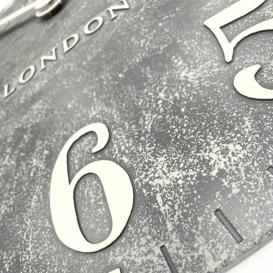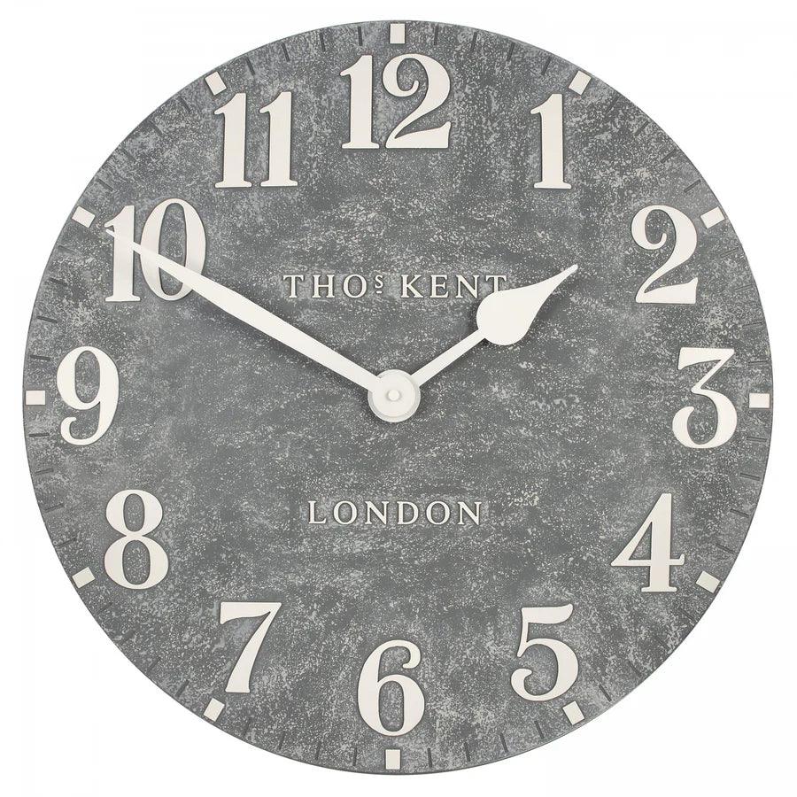 Our classic Arabic wall clock has been redesigned to withstand the challenges of the great outdoors. A hardy 20 inch dial showcases a cool cement grey base. The district Arabic numerals are shaded in a contrasting chalk white. A weathered effect sweeps over the curvaceous dial creating a stunning garden feature.