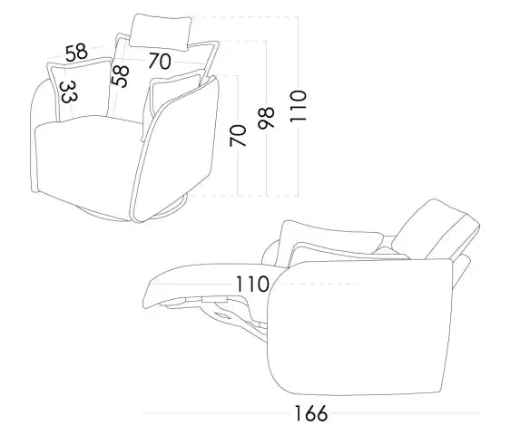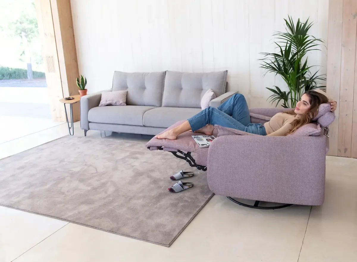 The Fama Eva recliner armchair is a stylish zero-wall electric swivel chair designed for modern living. Compact yet comfortable, it features slim arms for extra seating space, a smooth motorised reclining mechanism, and an extra-long footrest for full leg support. Choose between a sleek metal star base or a contemporary swivel ring base, both finished in black. Handcrafted in Spain and available in a wide choice of fabrics and leathers, the Eva offers customisable comfort and timeless design—perfect for any living room.
