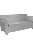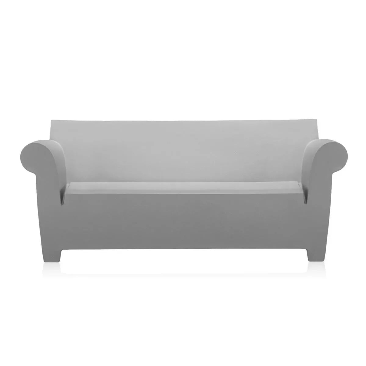 The Kartell Bubble Club Sofa in light grey is an industrial-style two-seater sofa created using rotational moulding technology, allowing Kartell to mass produce it. Featuring soft, rounded armrests that contrast with the more structured backrest, its essential silhouette evokes the nostalgic feel of "grandma's sofa." This large sofa is part of the Bubble Club collection, which also includes an armchair and occasional table, all available in the same finishes and colours. Together, they form a cohesive family of furniture, ideal for creating an "industrial lounge" to furnish outdoor spaces like gardens, poolside areas, or terraces.